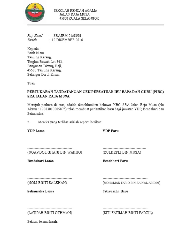 Untuk mengganti Specimen atau tanda tangan tersebut perlu adanya Surat Permohonan Perubahan Tanda Tangan dari Desa yang bersangkutan. Untuk saat ini belum tersedia. Yang berubah sahaja perlu tukar tandatangan pada cek PIBG. Dalam Contoh Berita Acara Serah Terima Barang Di Sekolah Gawe CV telah memilihkan tema atau template yang terbaik untuk dijadikan inspirasi ide ataupun acuan dalam penulisan surat anda. XxKodePerusahaanNama PerusahaanBln RomawiTahun Lampiran. Kepada setiausaha PIBG yang baharu saya nak share contoh surat surat tukar tandatangan cek YDP setiausaha dan bendahari PIBG yang baharu.